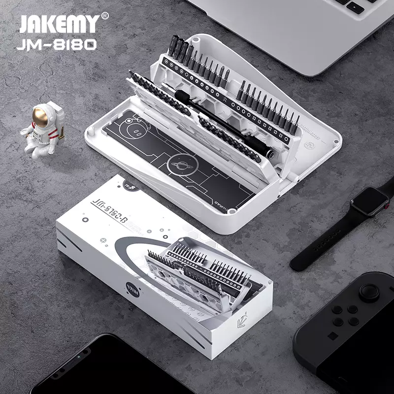 The 47 in 1 precision screwdriver set JM-8180 A/B is a compact, complete toolkit designed for electronics repair, small appliance maintenance, and hobby projects. Built with CR-V (chrome vanadium) bits, a magnetic handle and laser-engraved scale, this set combines accuracy, durability and portability to meet everyday needs.