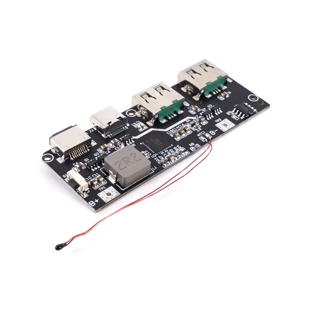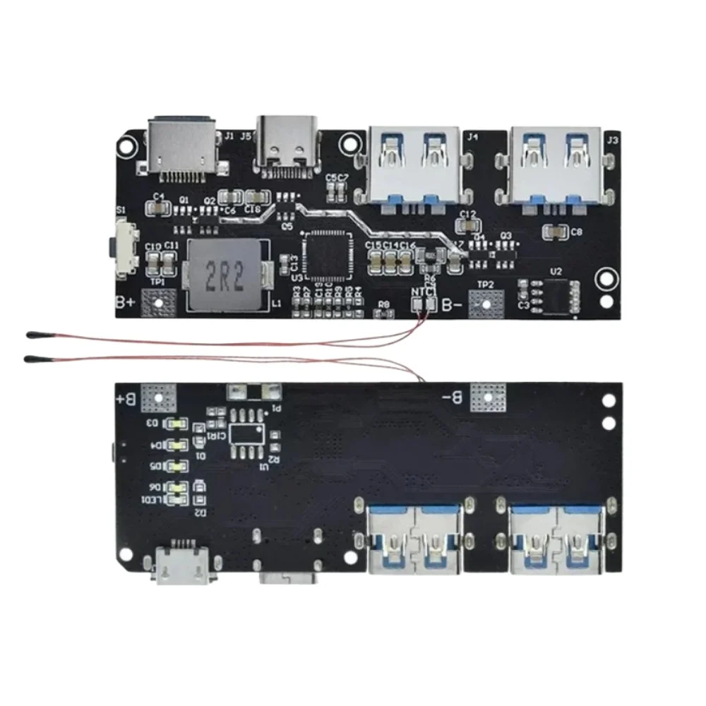 This module converts the voltage from single or multiple lithium batteries (3.7V) into high-power USB outputs up to 22.5W, enabling rapid charging for devices such as smartphones, tablets, and other USB-powered electronics. It also integrates battery management, boost converter, fuel gauge, and LED indicators, making it an ideal solution for custom power bank projects.