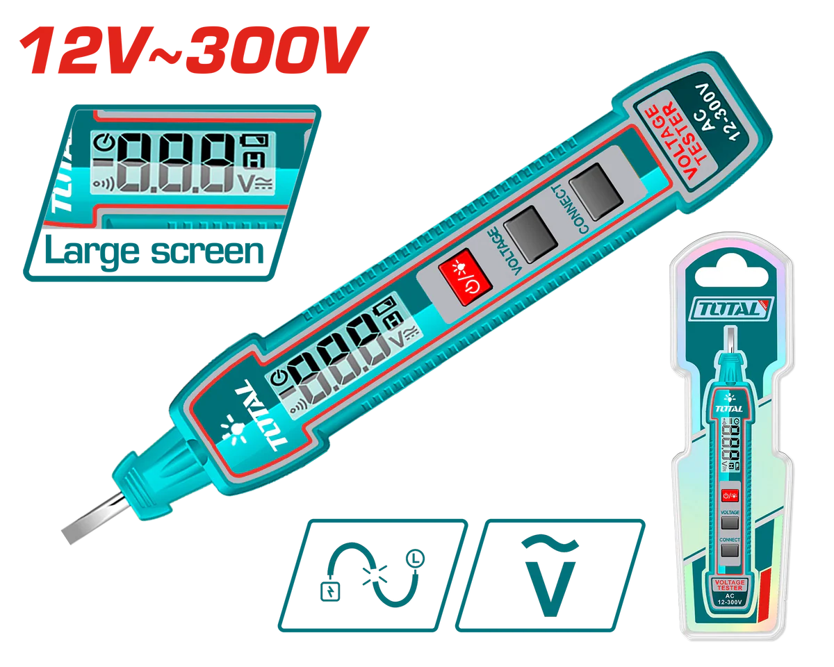 The Total Test pencil THTS33001 is a compact and reliable voltage tester designed for quick AC checks between 12 and 300V. It combines an LCD digital display with audible and visual alarms for safe, accurate detection of live circuits in both professional and DIY environments.